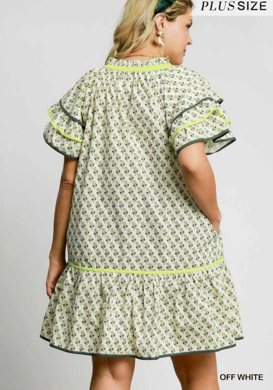 Green/Off White Mix Flutter Sleeves Mini Dress (PLUS)