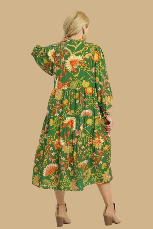 Green Floral Tiered Midi Dress (PLUS)
