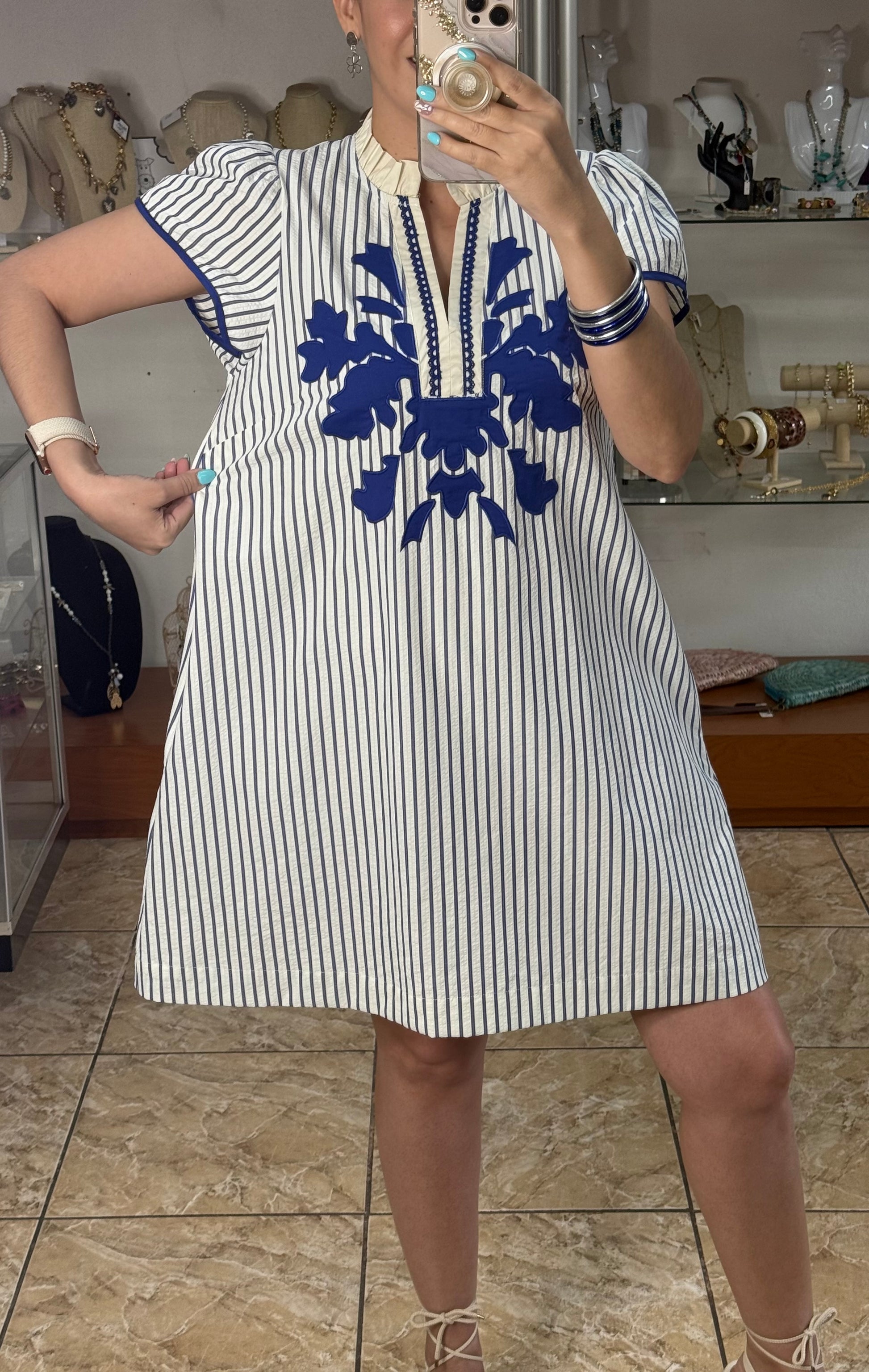 Blue Stripes Embroidered Short Dress