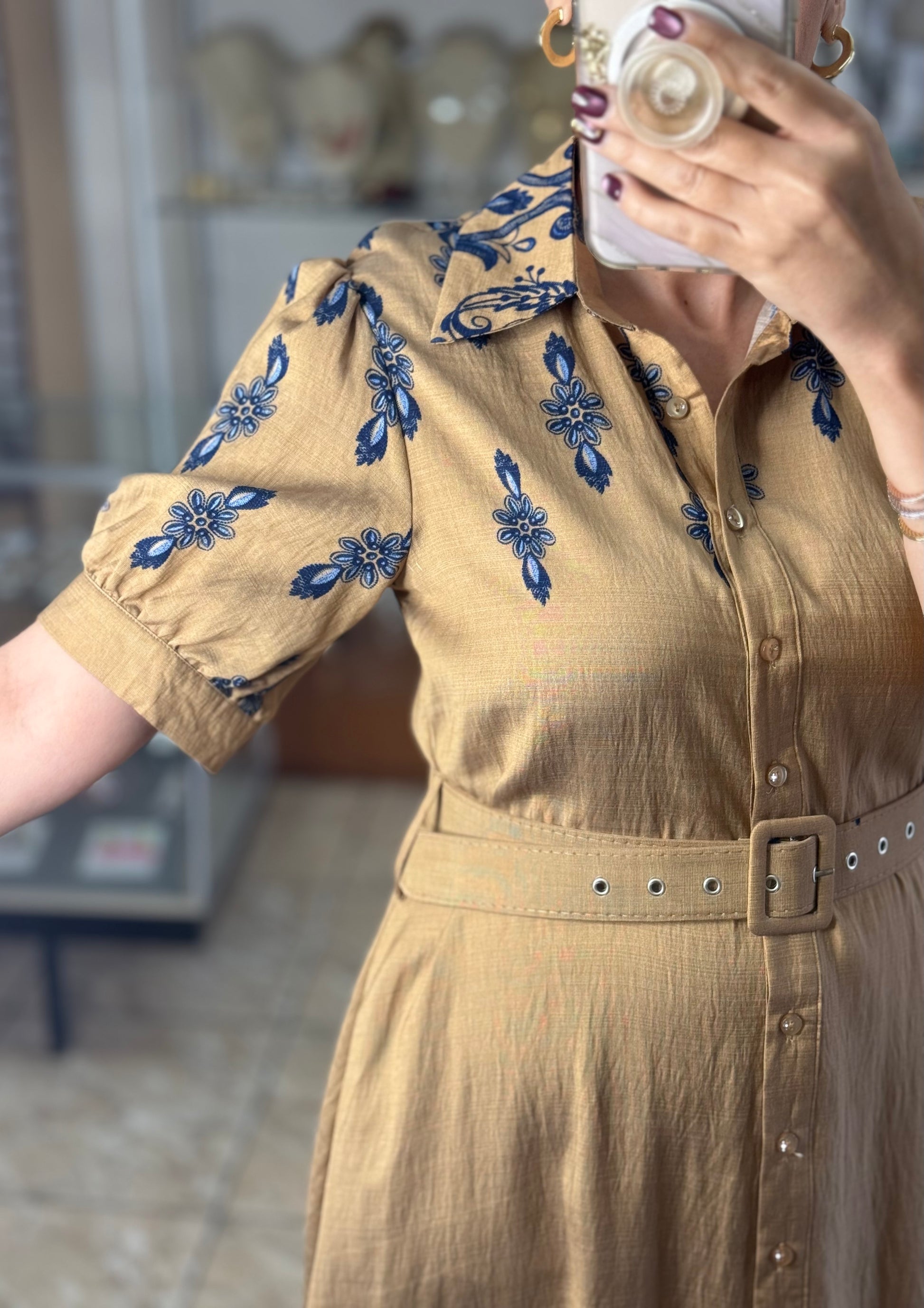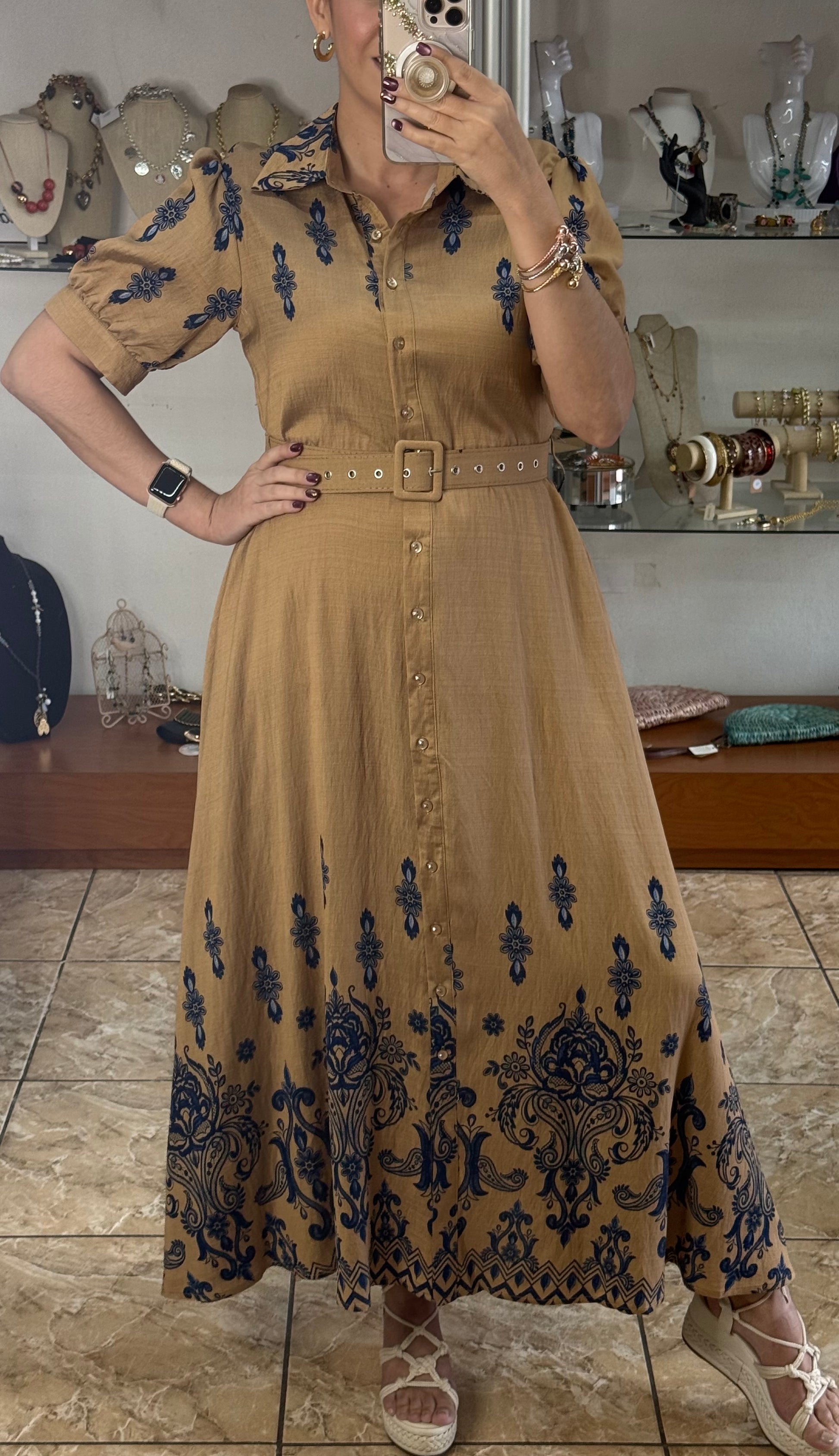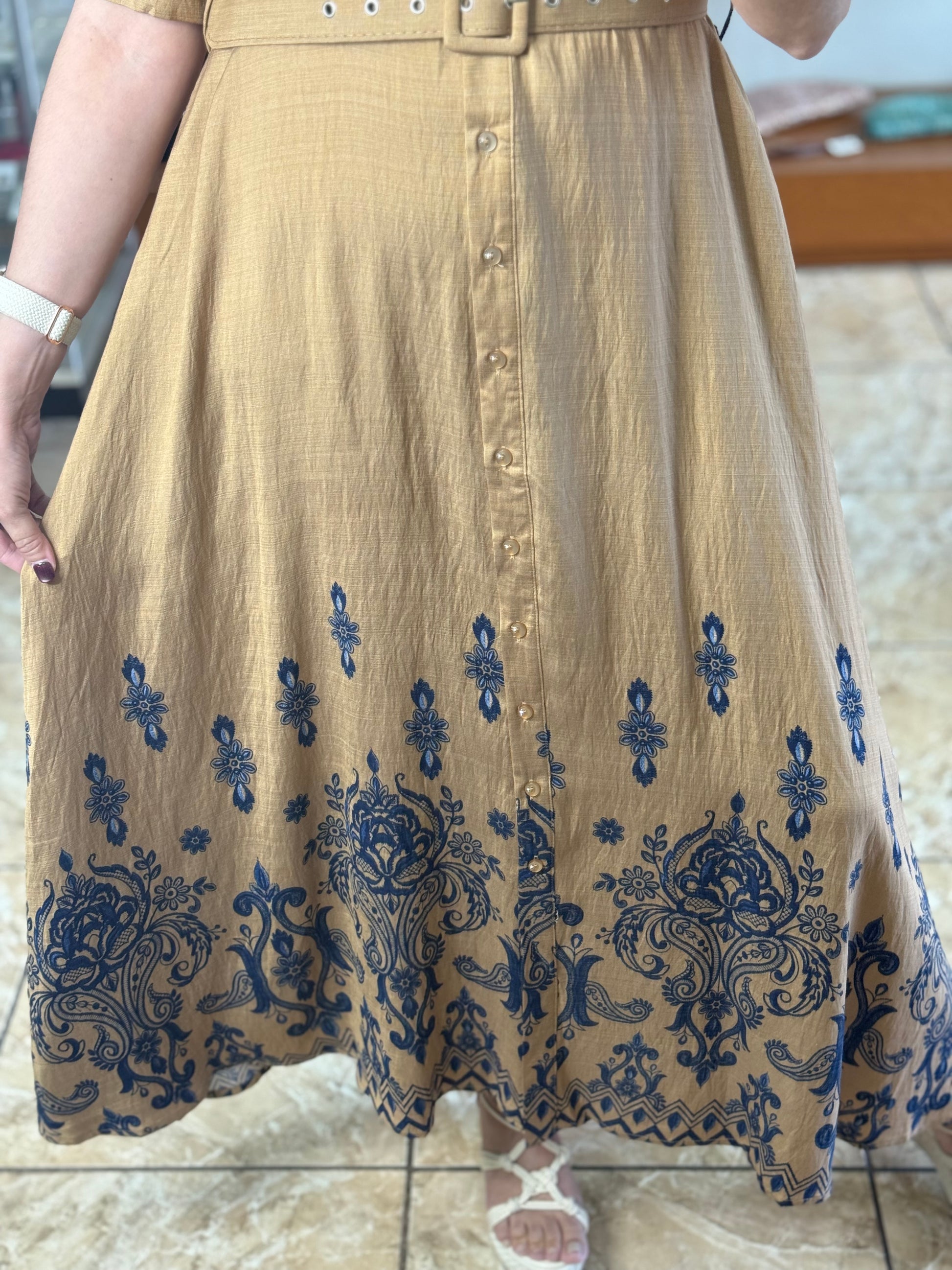 Khaki/Blue Maxi Floral Button Down Dress (Reg and Plus)