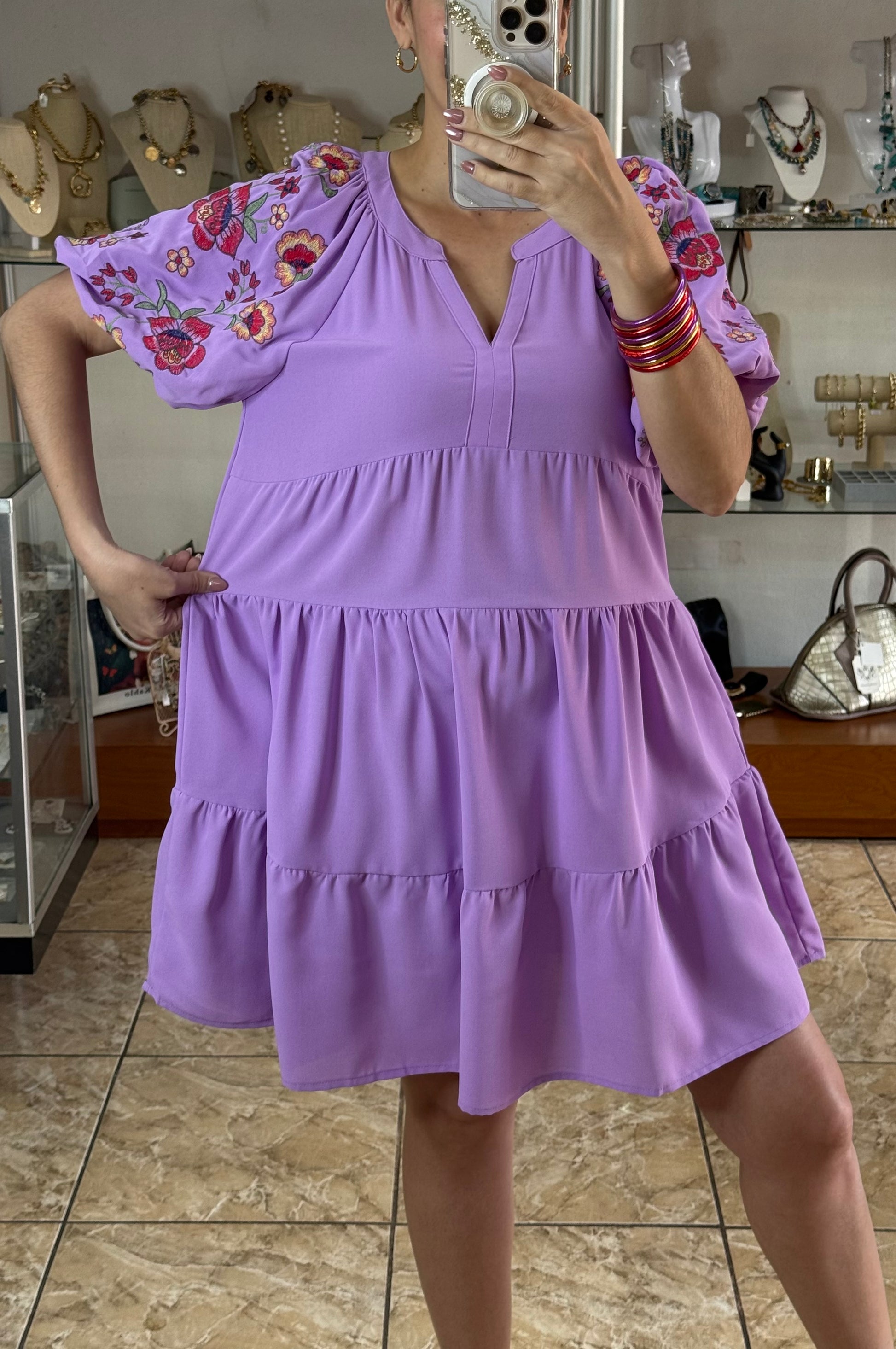 Embroidered sleeves babydoll dress.